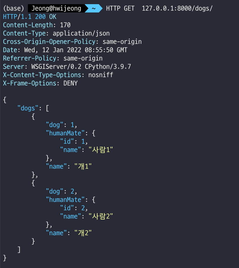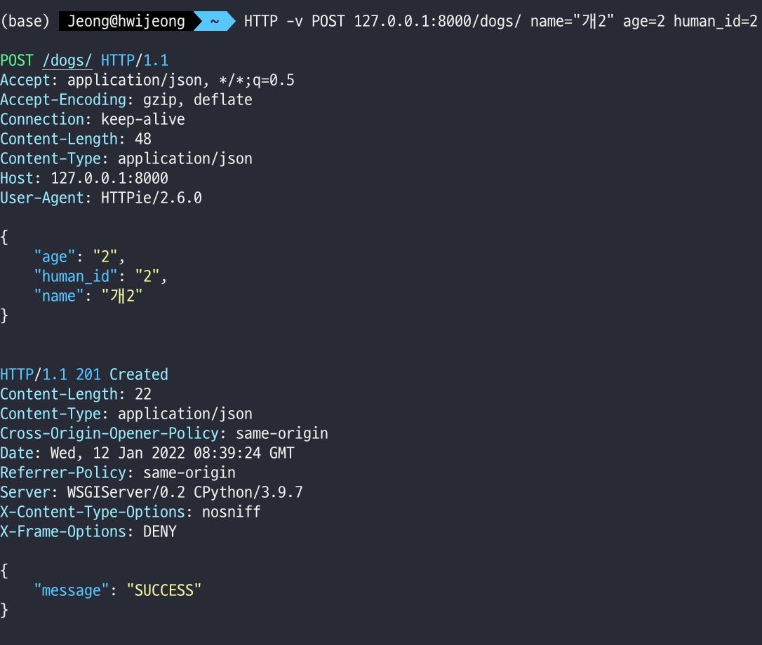 HTTP -v POST 127.0.0.1:8000/dogs/ name="개2" age=2 human_id=2