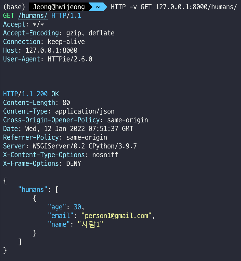 http -v POST 127.0.0.1:8000/humans/ name="사람1" email="human1@gmail.com" age=30