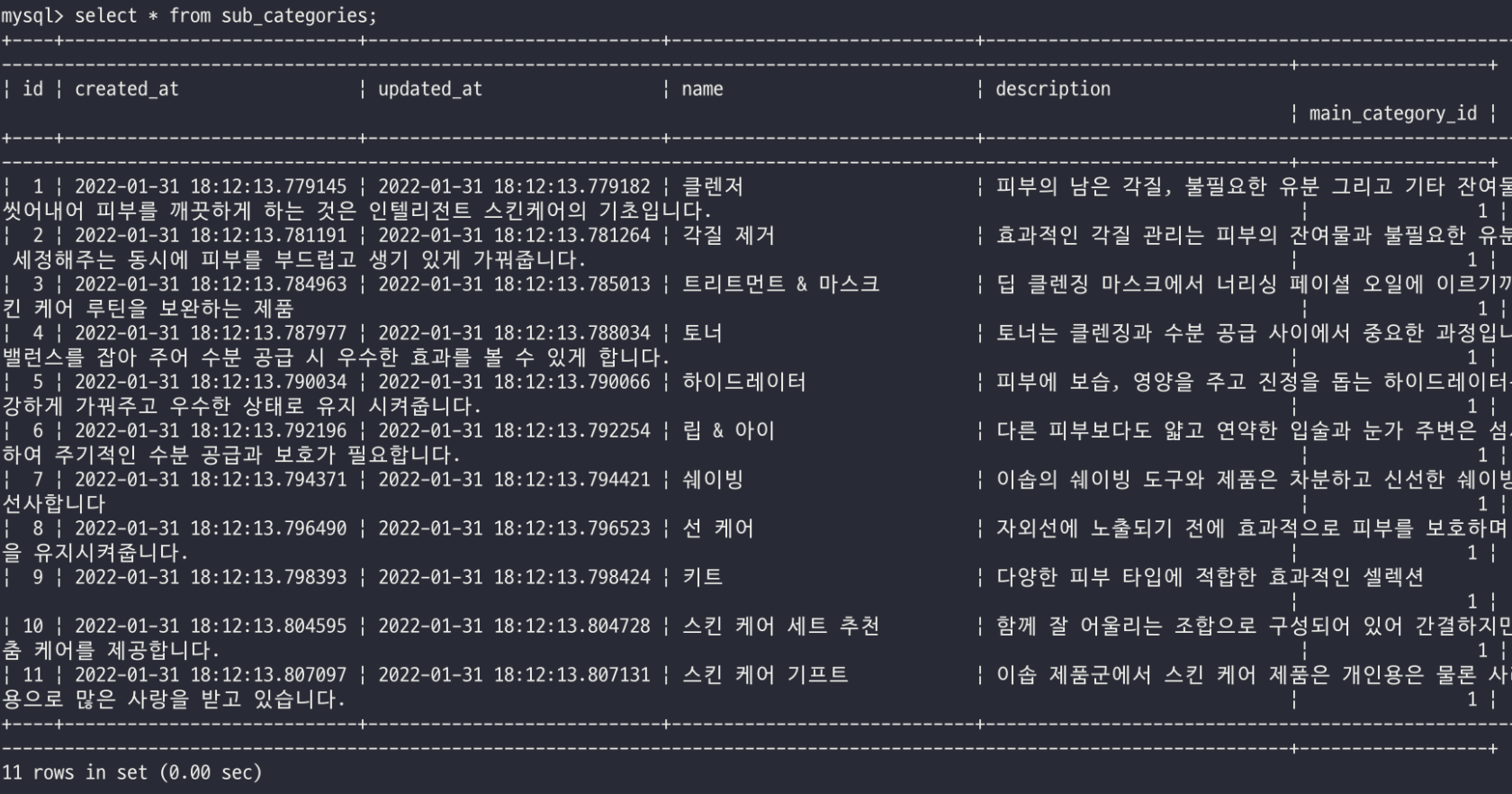이상없이 파이썬 파일이 실행되었다면 이제 mysql을 열어 데이터베이스를 확인해봅니다. 다음과 같이 정상적으로 데이터베이스에 csv 파일 데이터가 추가되었다면 성공입니다!