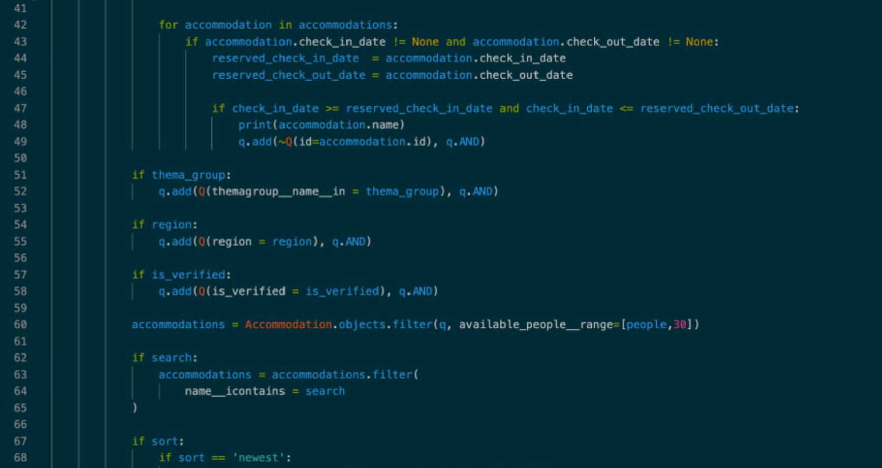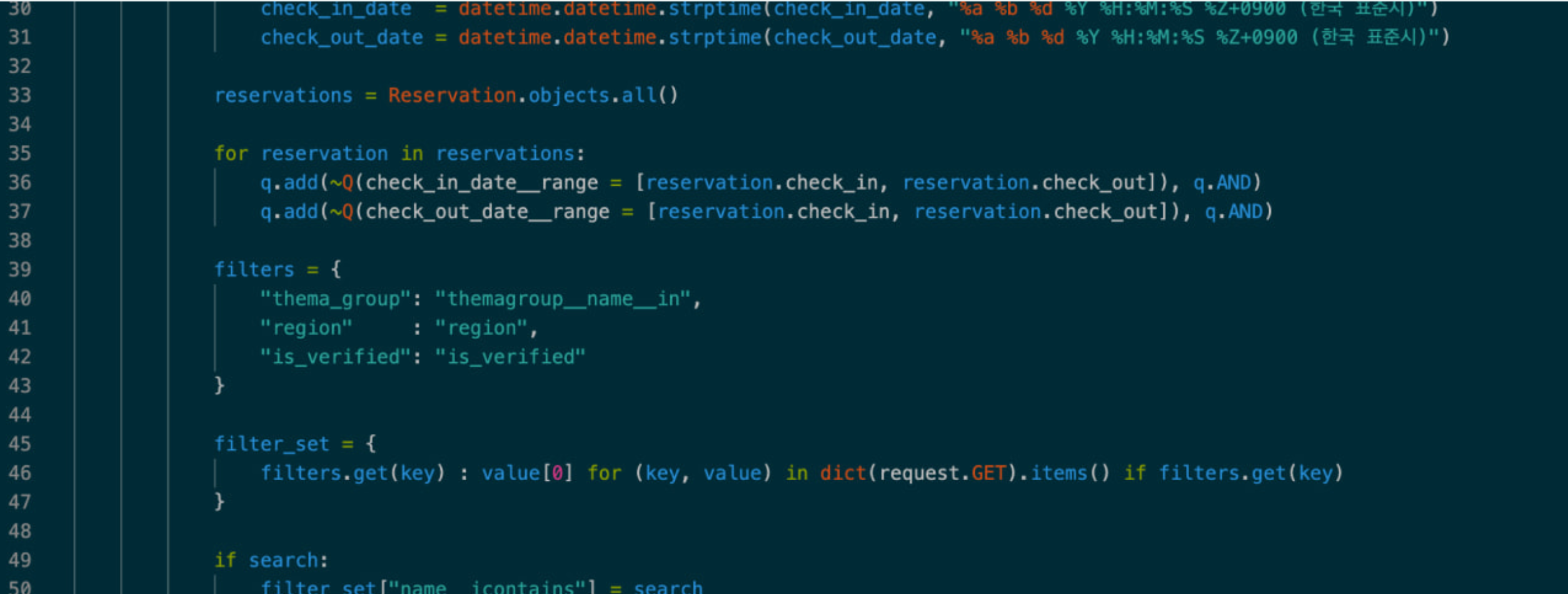 가장 기억에 남는 부분은 장고에서 숙소 필터링을 구현하는 부분이었습니다. 처음에는 필터링 부분을 if 구문 분기 처리와 Q 객체를 사용해 처리했던 것을 피드백을 받은 다음에는 filter 딕셔너리로 담는 방식으로 리팩토링했습니다. 그러나 이 방법을 온전하게 이해한 것은 아니라서 여전히 공부가 필요한 상황입니다. 또한 숙소 예약을 처리하며 dateitme 필드를 사용하는 방법에 대해서도 새롭게 학습할 수 있었습니다.